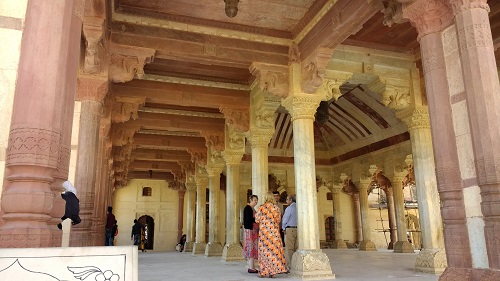 When the queen Mumtaz Mahal died, her tomb was placed along the axis of symmetry, centered in the room. It is a rectangular tomb made of marble with carving across every surface. It's beautiful. It lays with its length north and south and its width east and west.